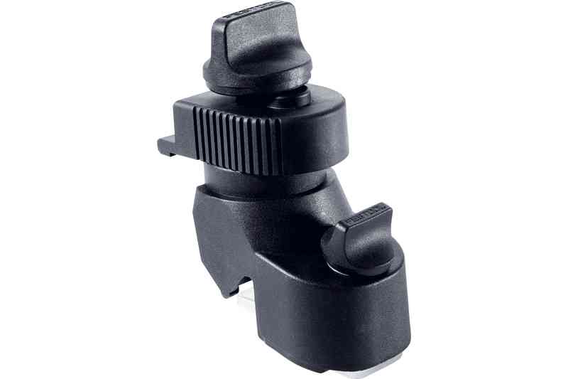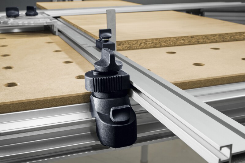 - Beznarzędziowy montaż w rowku o kształcie litery V stołu MFT za pomocą pokręteł