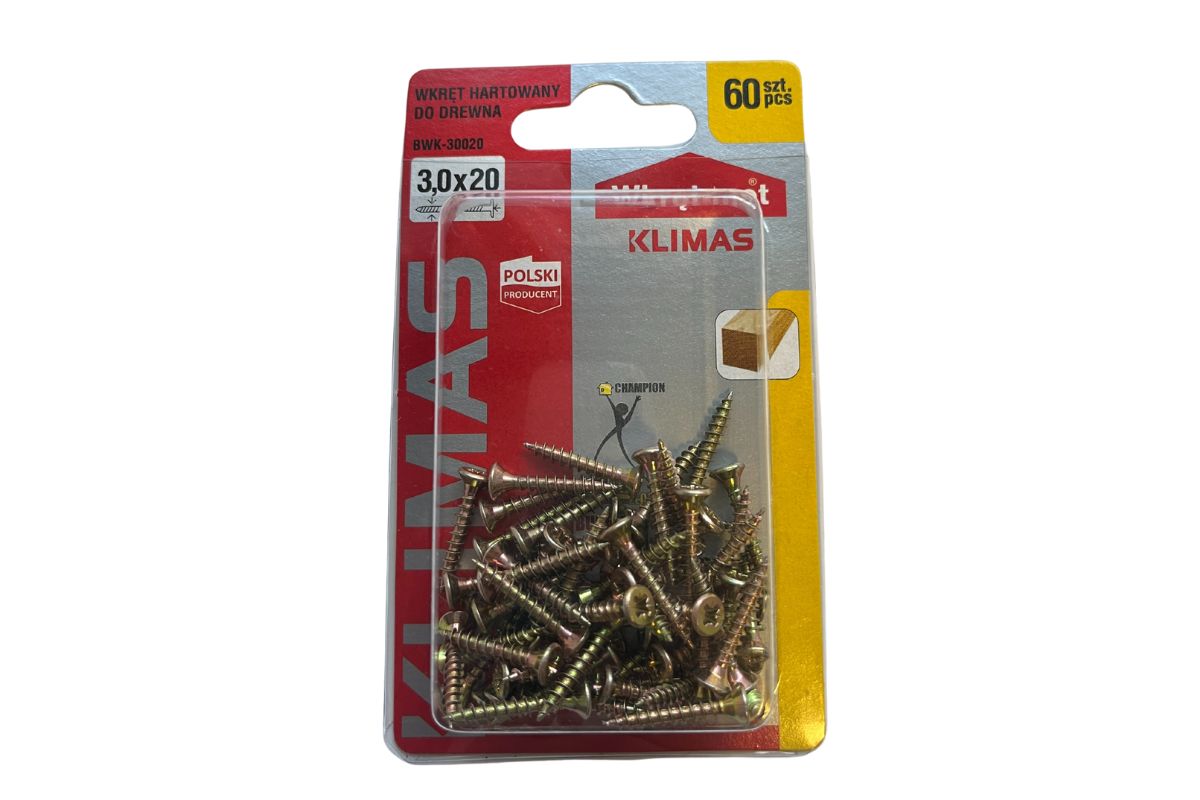 Hartowany wkręt do drewna firmy Klimas Wkręt-met to wysokiej jakości element mocujący, przeznaczony do trwałego łączenia elementów drewnianych oraz materiałów drewnopochodnych, takich jak płyty wiórowe, MDF czy OSB. Dzięki procesowi hartowania wyróżnia się zwiększoną wytrzymałością oraz odpornością na złamania, co zapewnia stabilność i trwałość połączeń. Precyzyjny gwint umożliwia łatwe i szybkie wkręcanie, minimalizując ryzyko uszkodzenia materiału. Wkręt doskonale sprawdza się zarówno w profesjonalnych pracach stolarskich, jak i w domowych zastosowaniach montażowych.